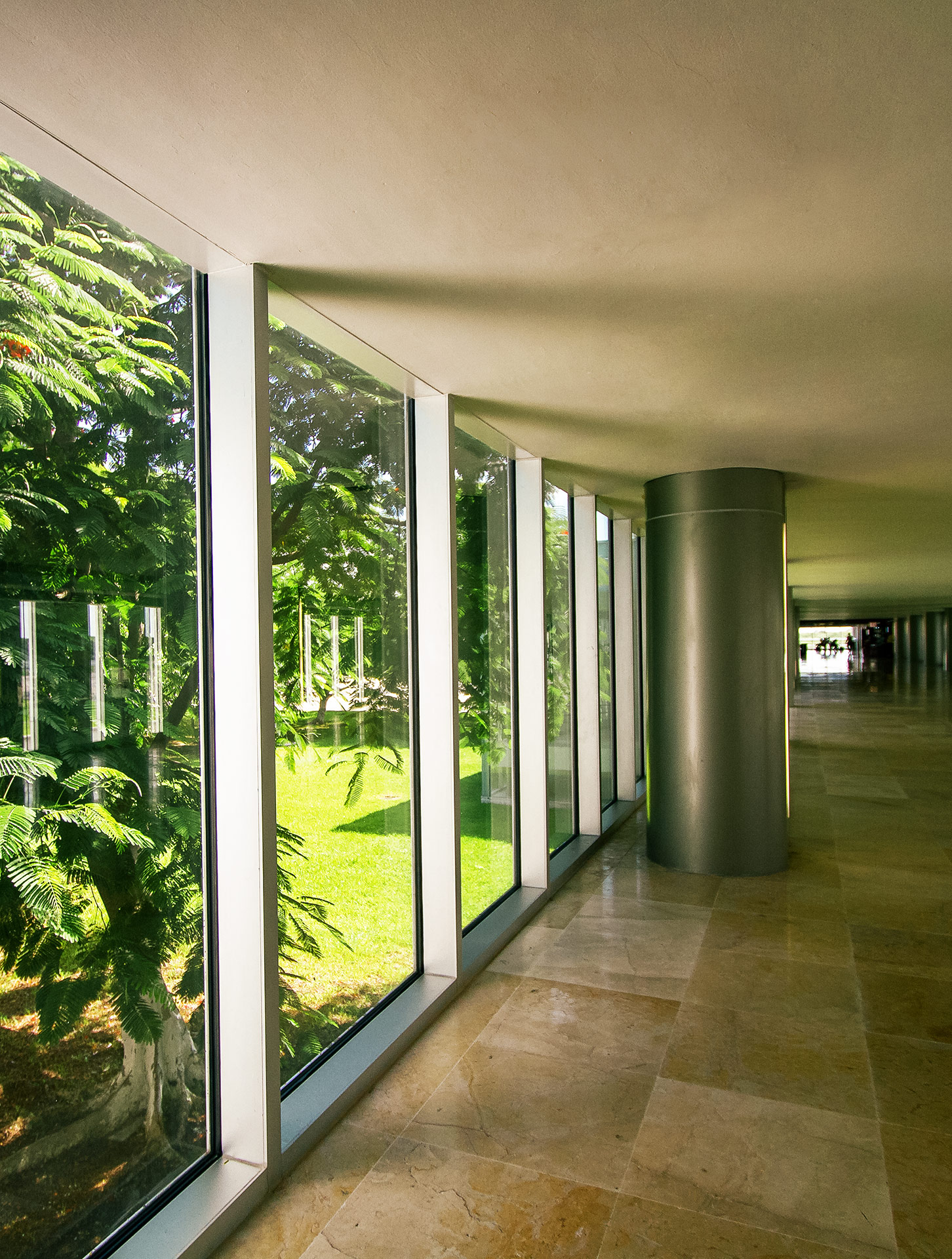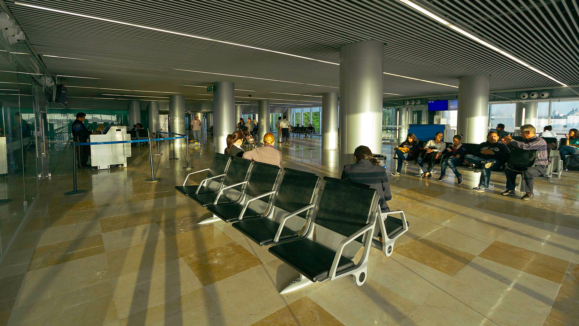Natural light and an interior forest were prioritized, with artificial light integrated into columns and ceiling panels to guide visitors; in the lounges, it blends with the sky and the airplanes. The porticos, like asymmetrical umbrellas, provide rhythm and capture the surrounding landscape.