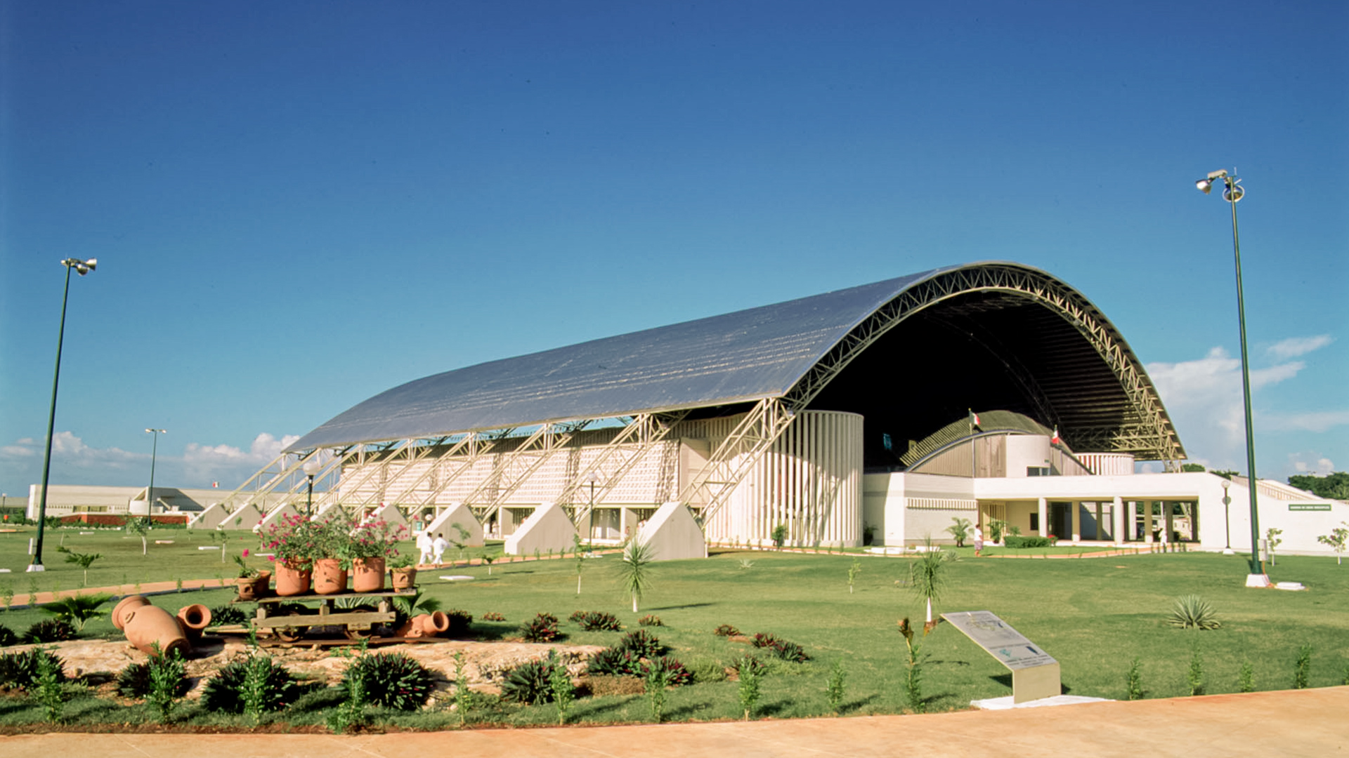 On a 14.2-hectare site west of Mérida, a complex of buildings and green areas has been created, with roads, parking lots, and bike paths radiating outwards, giving priority to interior pedestrian walkways among trees and aromatic flowers. Their foliage allows visitors to discover stone structures covered by metal umbrellas that seem to blend their reflective surfaces with the blue of the sky.